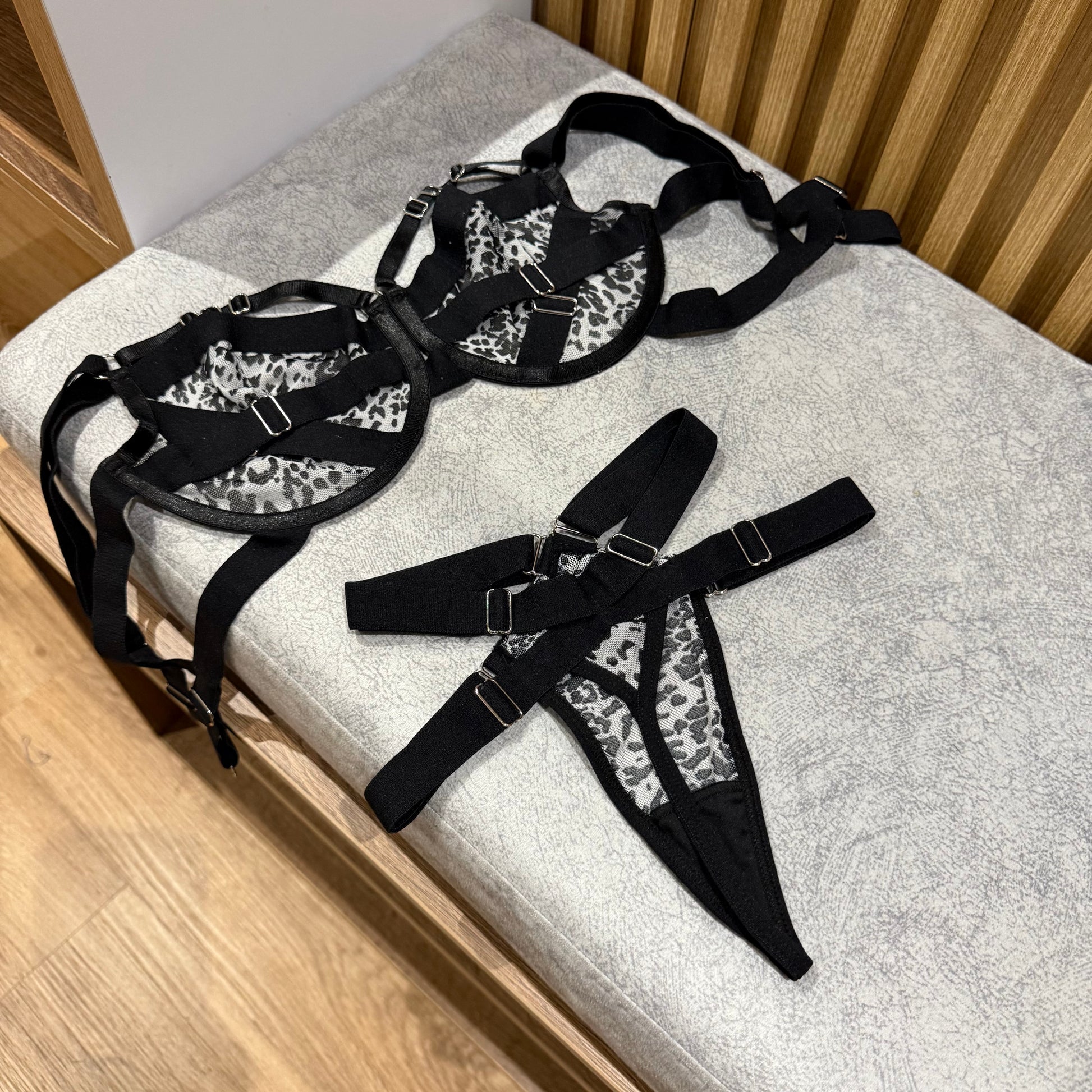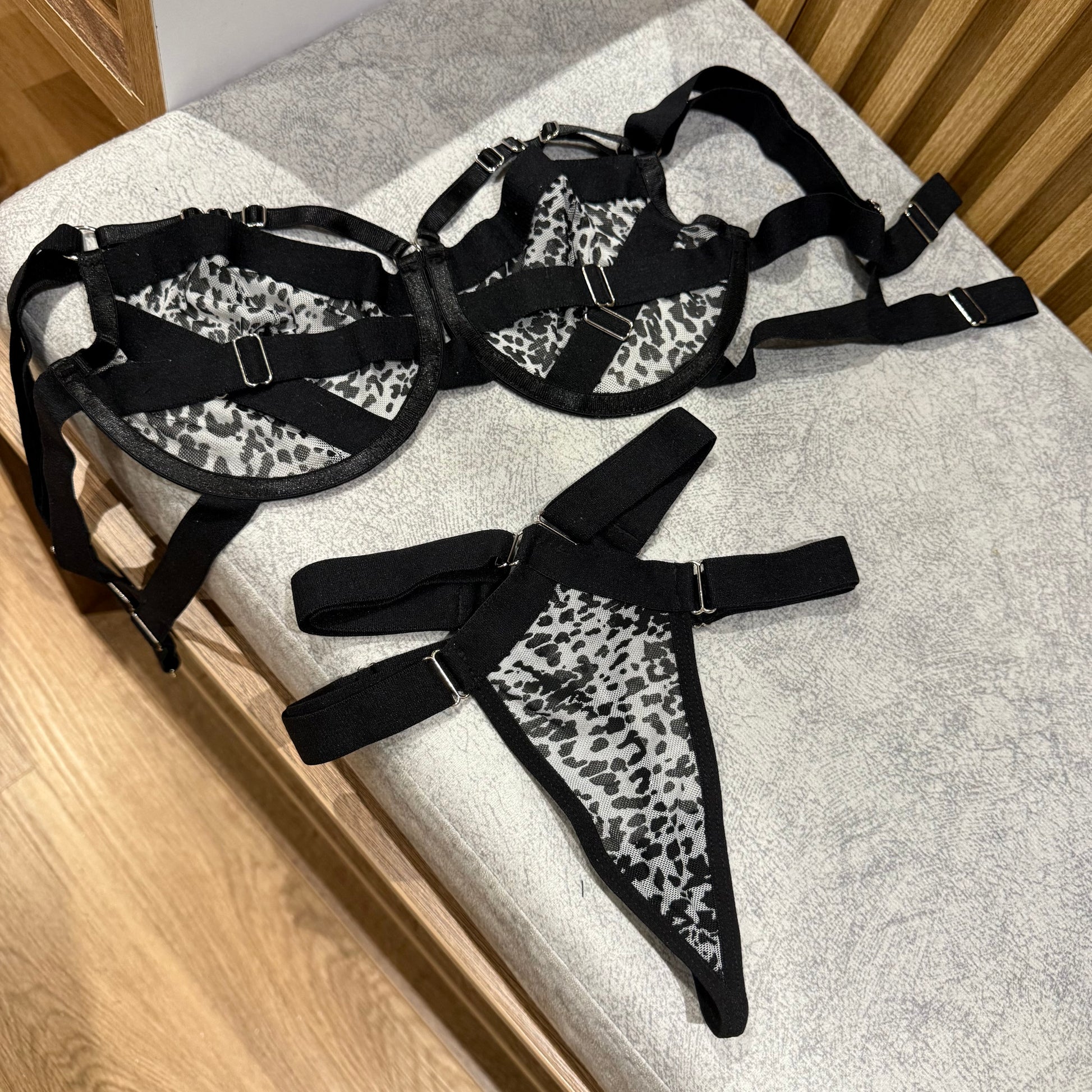 - Brasier con Varias Tiras y Herrajes: El brasier está diseñado con múltiples tiras que crean un efecto audaz y sofisticado, complementado con herrajes metálicos que aportan un toque de lujo y sensualidad.